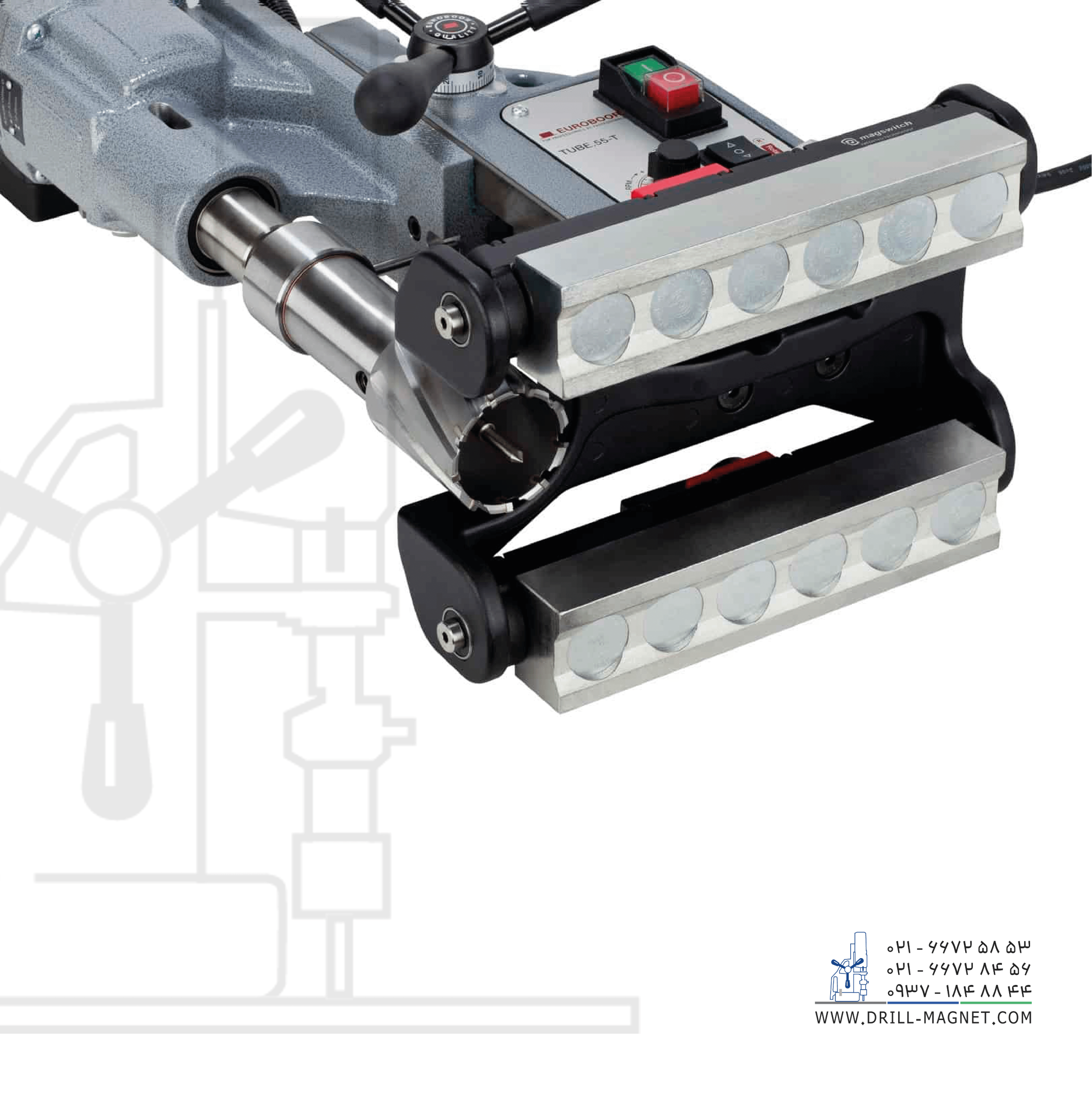 ساخت کشور هلند. دریل مگنت مدل TUBE.55S/T محصول شرکت یوروبور هلند، با قابلیت حمل و موتور پر قدرت 1740 وات مناسب سوراخکاری روی ورق مسطح و لوله است. TUBE.55S/T به دلیل مجهز بودن یه فناوری مغناطیسی میدان کم عمق، قدرت فوقالعاده قوی حتی روی فولادی به ضخامت 3 میلیمتر را ارائه میدهد. این دریل مغناطیسی روی فلز سوراخهایی تا 55 میلیمتر برش میدهد و می تواند بدون هیچ تلاشی به دلیل آهنربا محوری بر روی لوله با قطر 80 میلیمتر و بزرگتر استفاده شود.