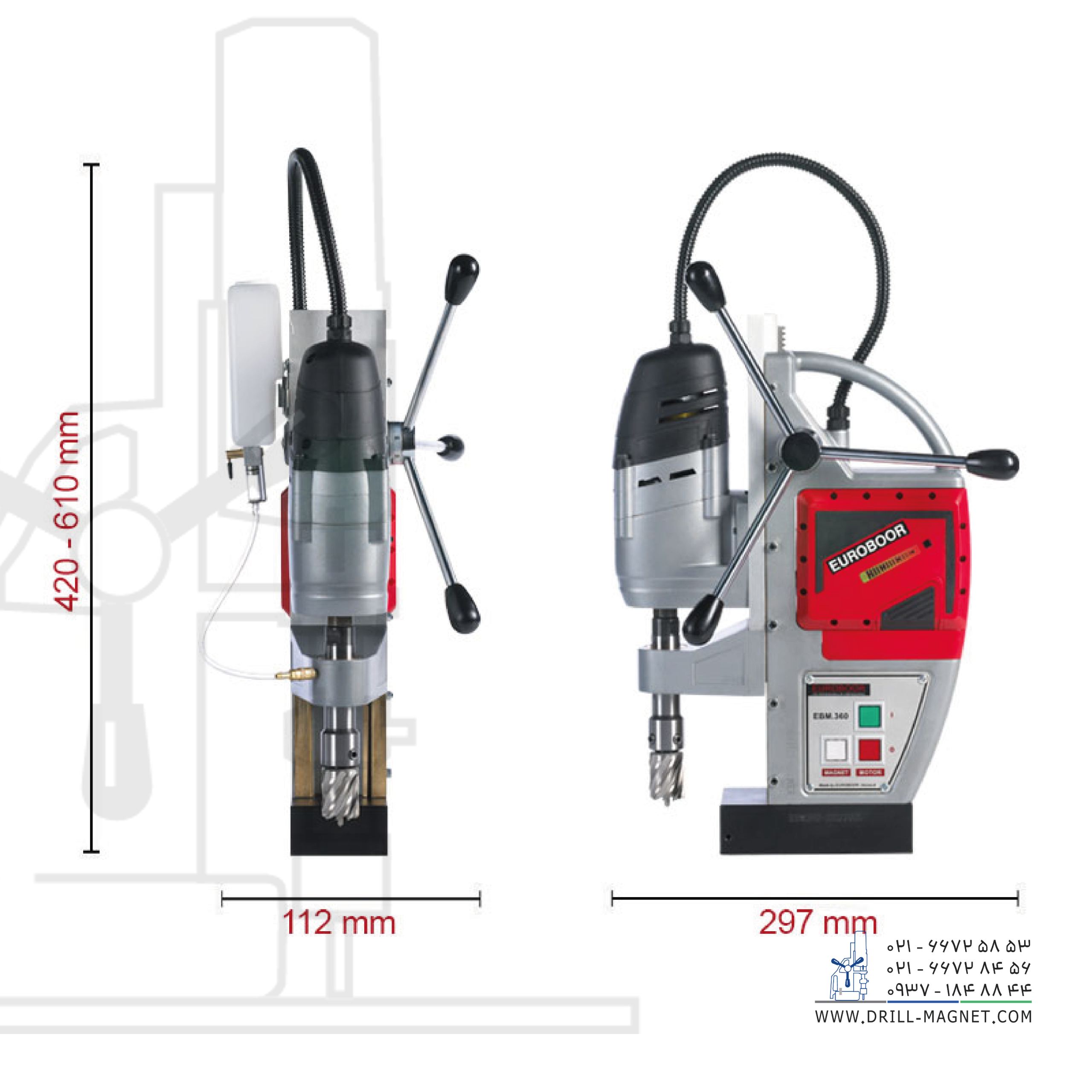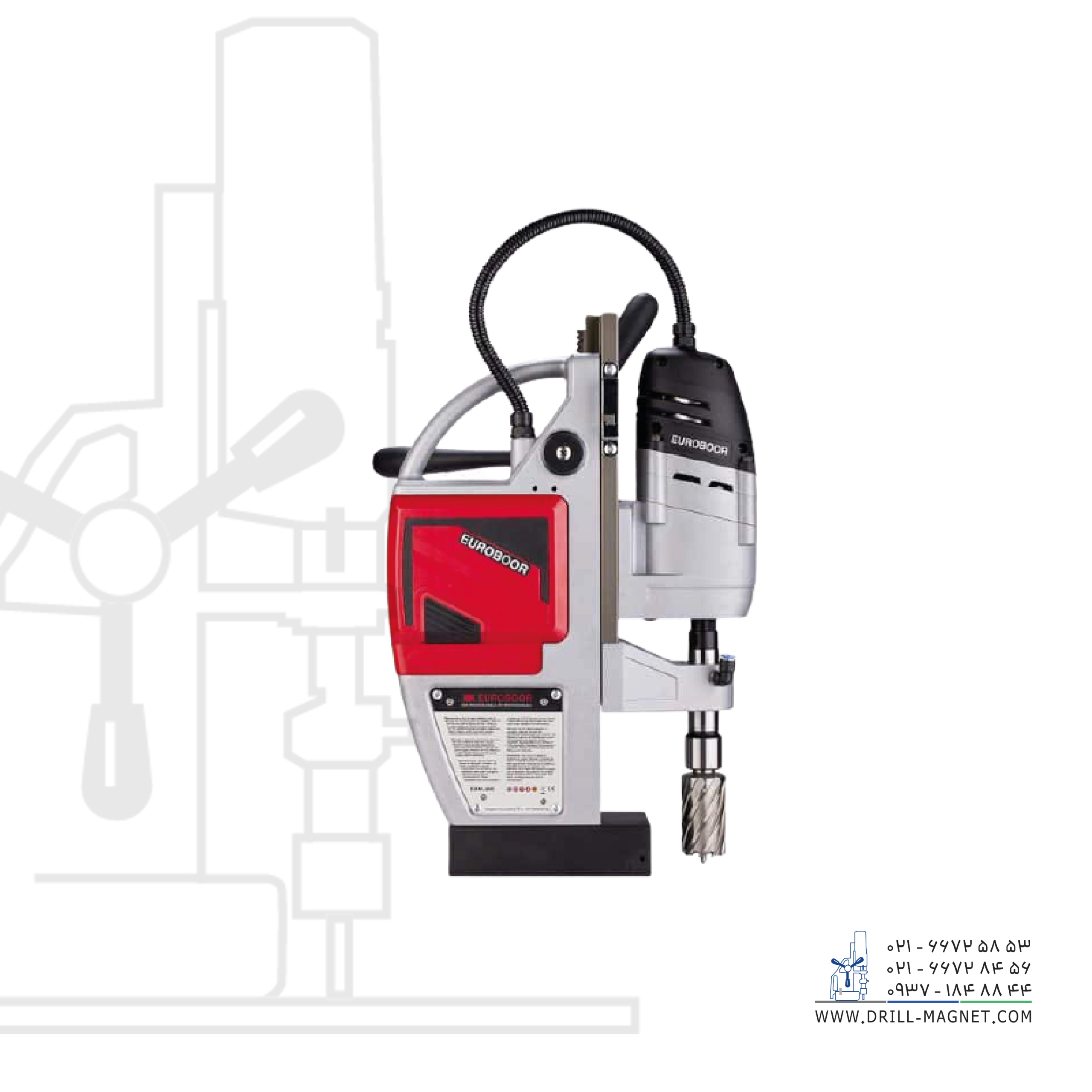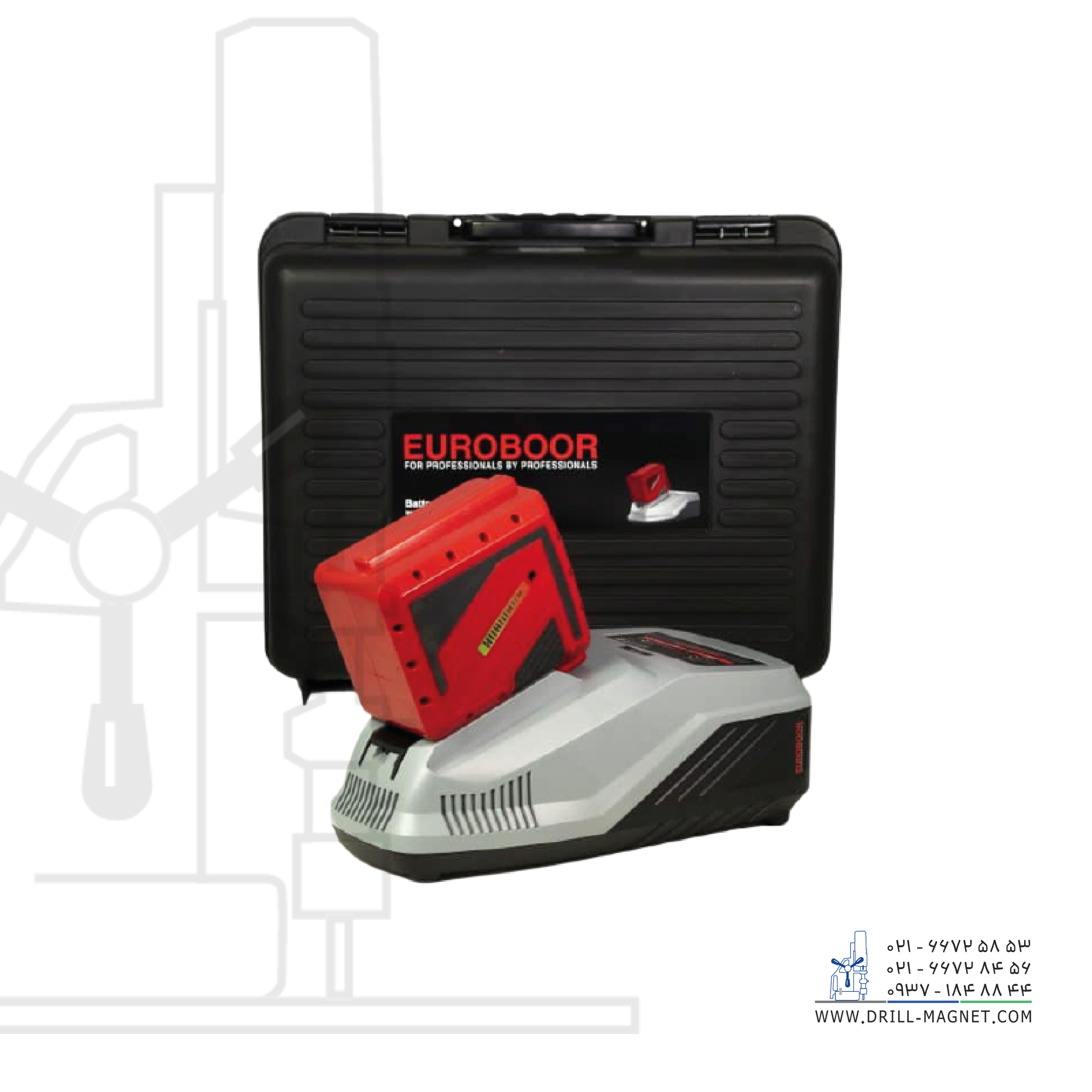 ساخت کشور هلند. دریل مگنت شارژی مدل EBM.360 محصول شرکت یوروبور هلند به دلیل داشتن مگنت و موتور شارژی، وزن سبک، حجم کم، بدون سیم بودن به کاربر اجازه میدهد تا با راحتی دستگاه را در اماکن مرتفع و یا با دسترسی سخت (مانند سازههای فلزی عمودی، تیرهای ساختمانی و …) جابهجا کند.