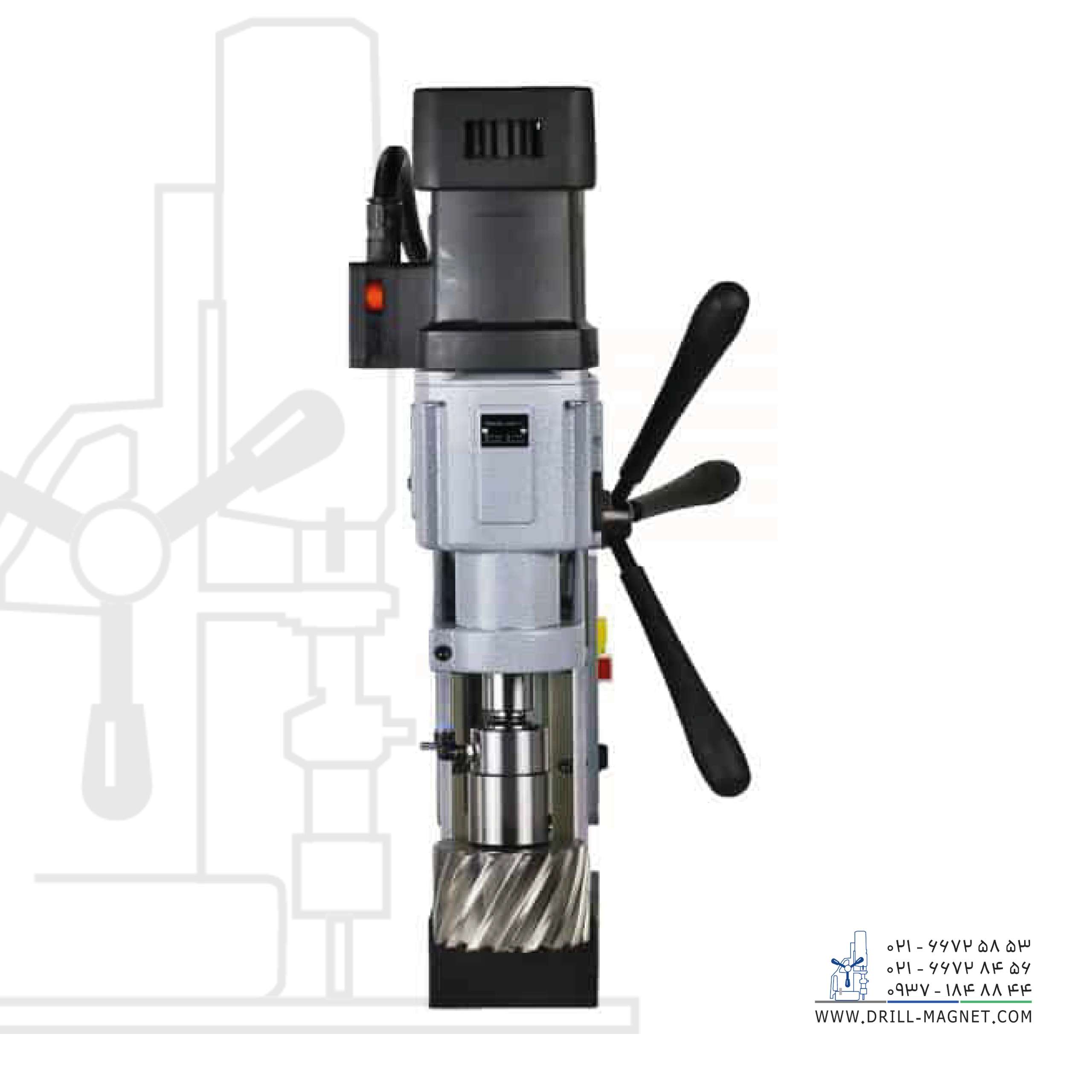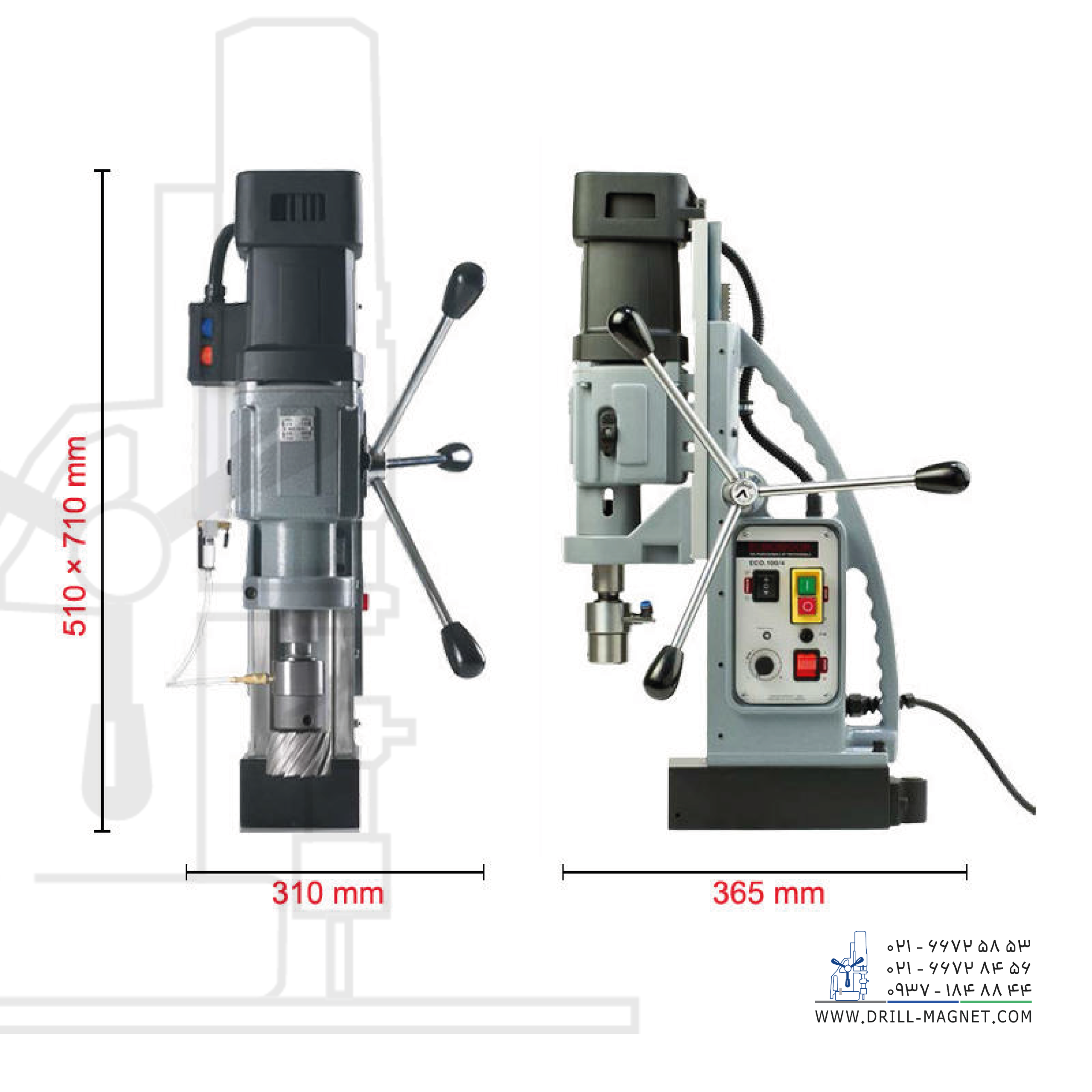 ساخت کشور هلند. دریل مگنت مدل ECO-100/4 محصول شرکت یوروبور هلند با موتور پرقدرت 1900 واتی دارای یک اسپیندل مورس تاپر 3 با خنککننده یکپارچه ابزار و مجهز به گیربکس چهار سرعته است که از قابلیت چرخش در جهت عقربههای ساعت و خلاف جهت عقربههای ساعت و تنظیم سرعت به دو صورت مکانیکی و الکترونیکی سود میبرد.