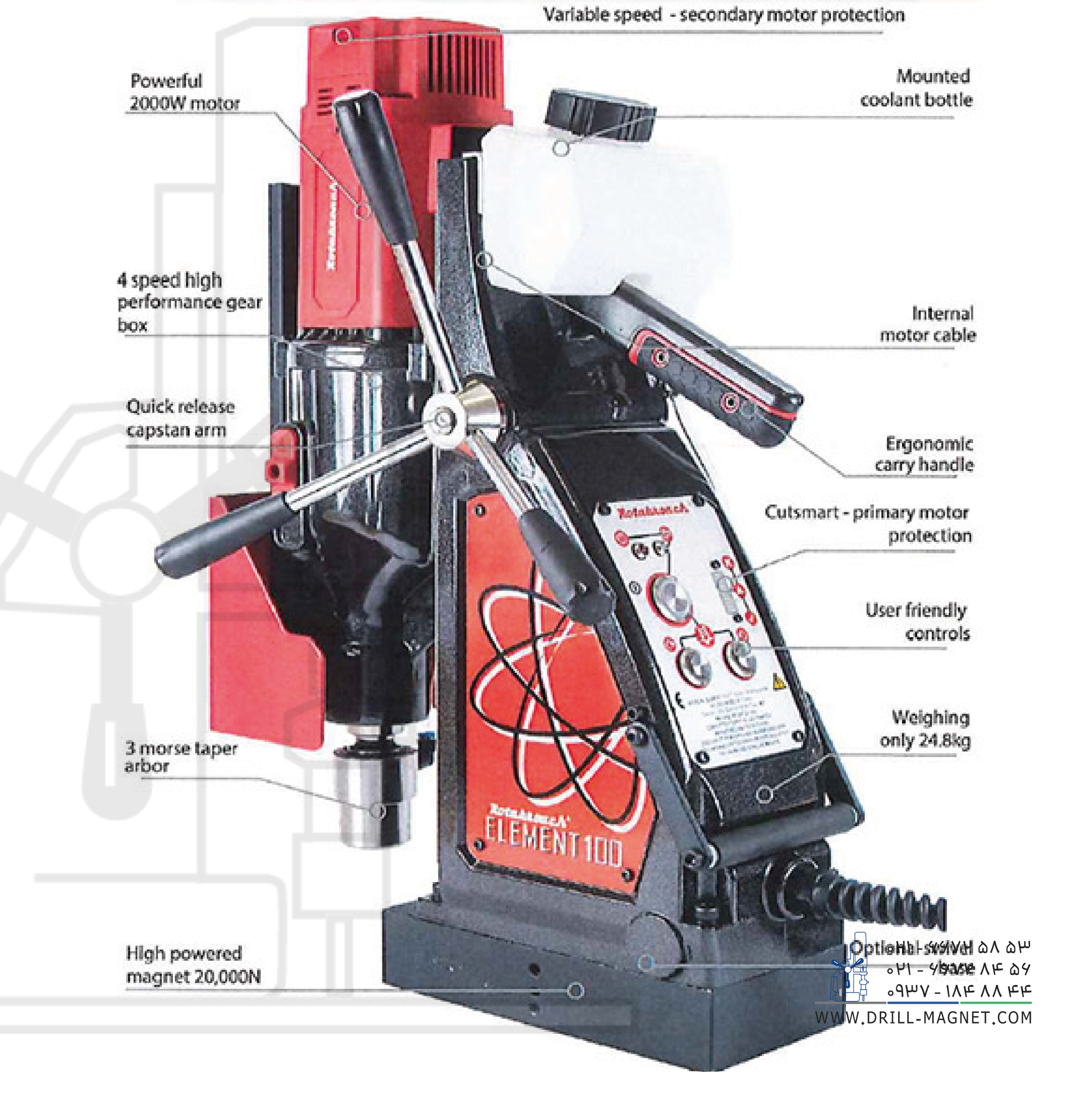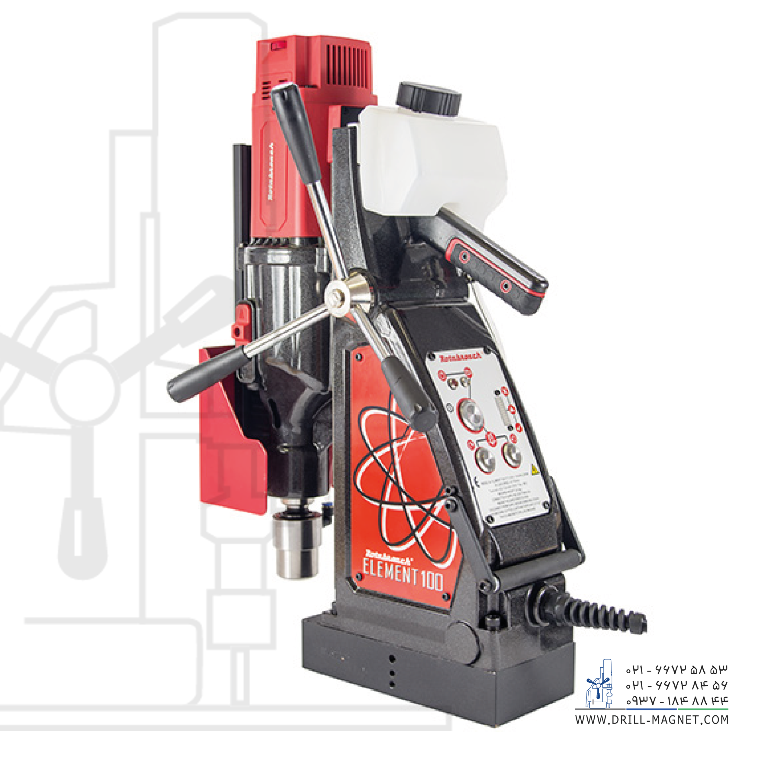 ساخت کشور انگلستان. دریل مگنت مدل Element-100 محصول شرکت رپتور انگلستان، با موتور ۲۰۰۰ واتی، مجهز به تکنولوژی برشی هوشمند جهت حفاظت از موتور، گیربکس ۴ سرعته با عملکردی بی نظیر است. قابلیت سوراخکاری با متههای مورس ۳، قابلیت سوراخکاری با مته گردبر قطر 100 و عمق ۱۰۰ میلیمتر، قابلیت سوراخکاری با مته ته گرد تا قطر ۱۶ میلیمتر، قابلیت قلاویزکاری تا قطر M30 از ویژگیهای این دریل مغناطیسی است. این دستگاه مناسب سوراخکاری، برش فولاد با استحکام بالا و موارد مشابه دیگر در اماکن مرتفع و یا با دسترسی سخت (مانند سازههای فلزی عمودی، تیرهای ساختمانی و …) است.