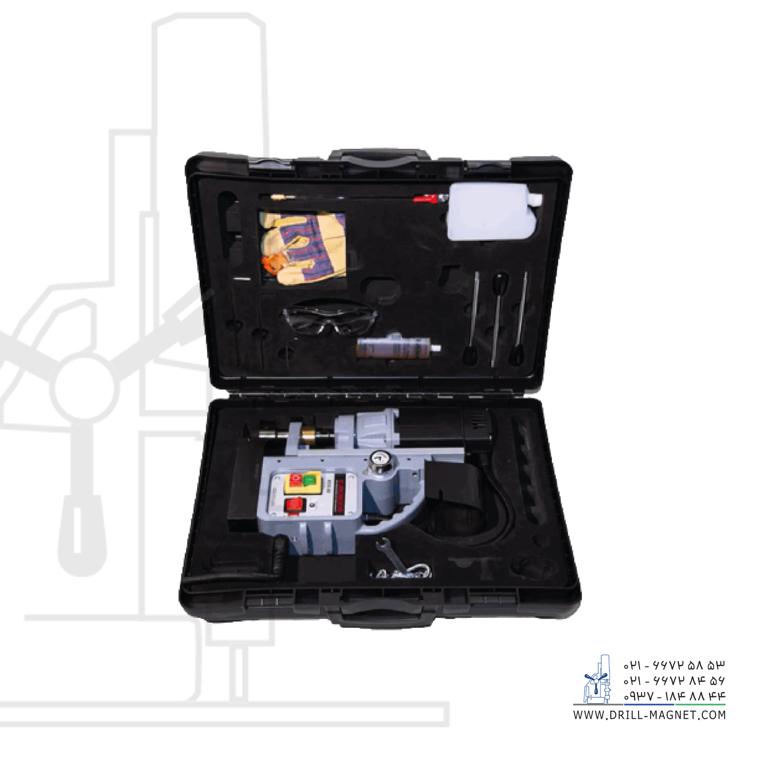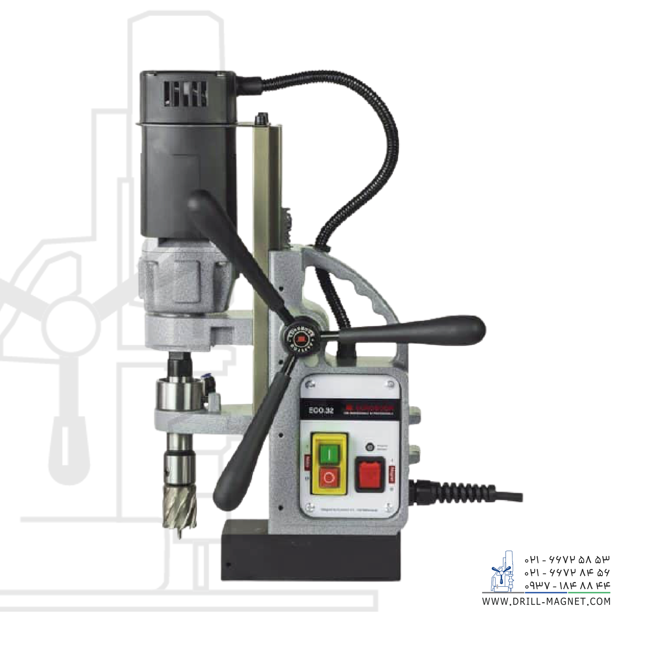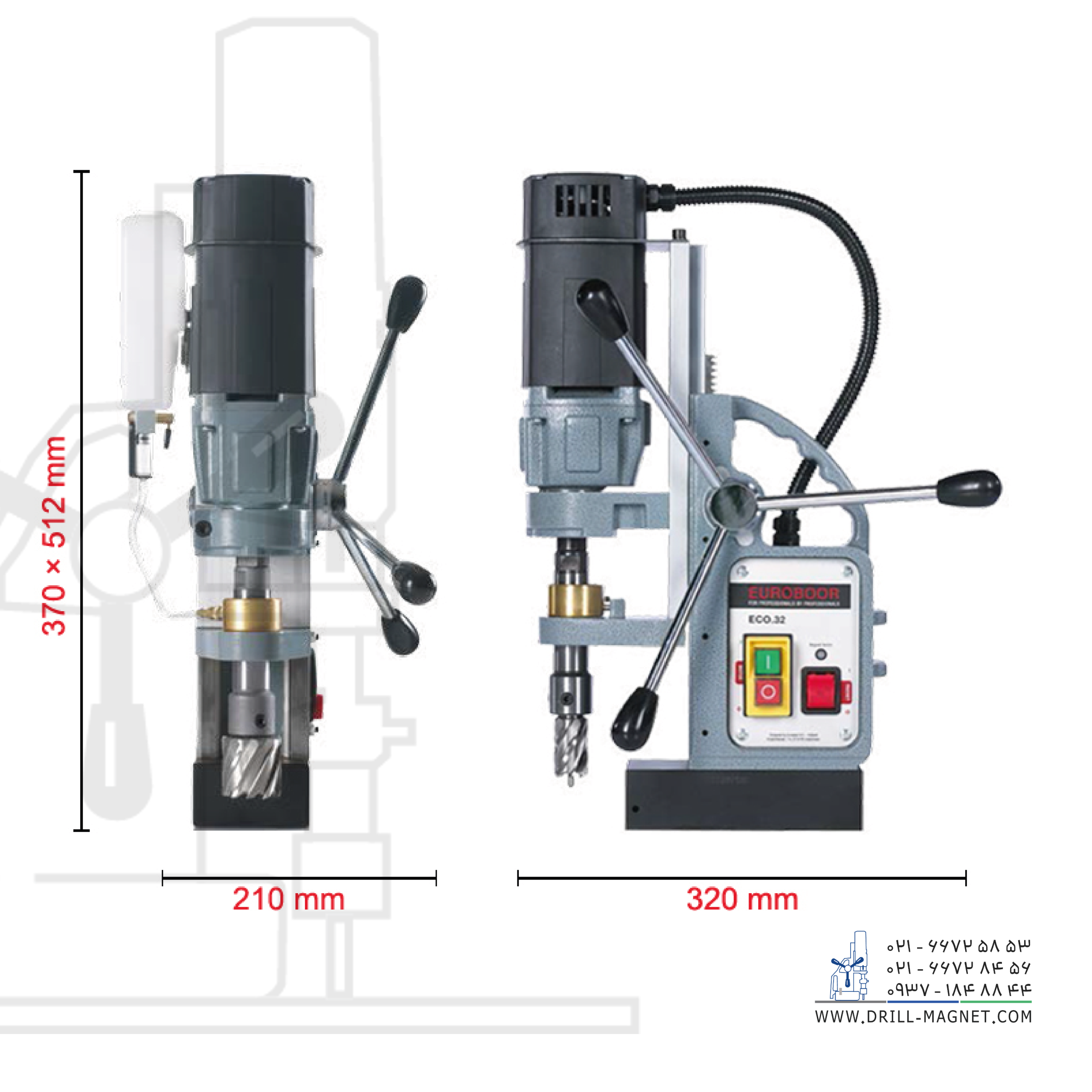 ساخت کشور هلند. دریل مگنت مدل ECO.32 محصول شرکت یوروبور هلند، با موتور ۱۰۰۰ واتی، سرعت ۴۰۰ دور در دقیقه زیر بار و سرعت ۷۷۵ دور در دقیقه بدون بار، تعویض سریع و آسان مته، ۱۲ کیلوگرم وزن، کورس کاری ۱۵۰ میلیمتری، سوراخکاری با مته گردبر حداکثر قطر ۳۲ میلیمتر و با مته معمولی حداکثر قطر ۱۳ میلیمتر مناسب سوراخکاری، برش فولاد و مواد مشابه دیگر در اماکن مرتفع و یا با دسترسی سخت (مانند سازههای فلزی عمودی، تیرهای ساختمانی و …) است.