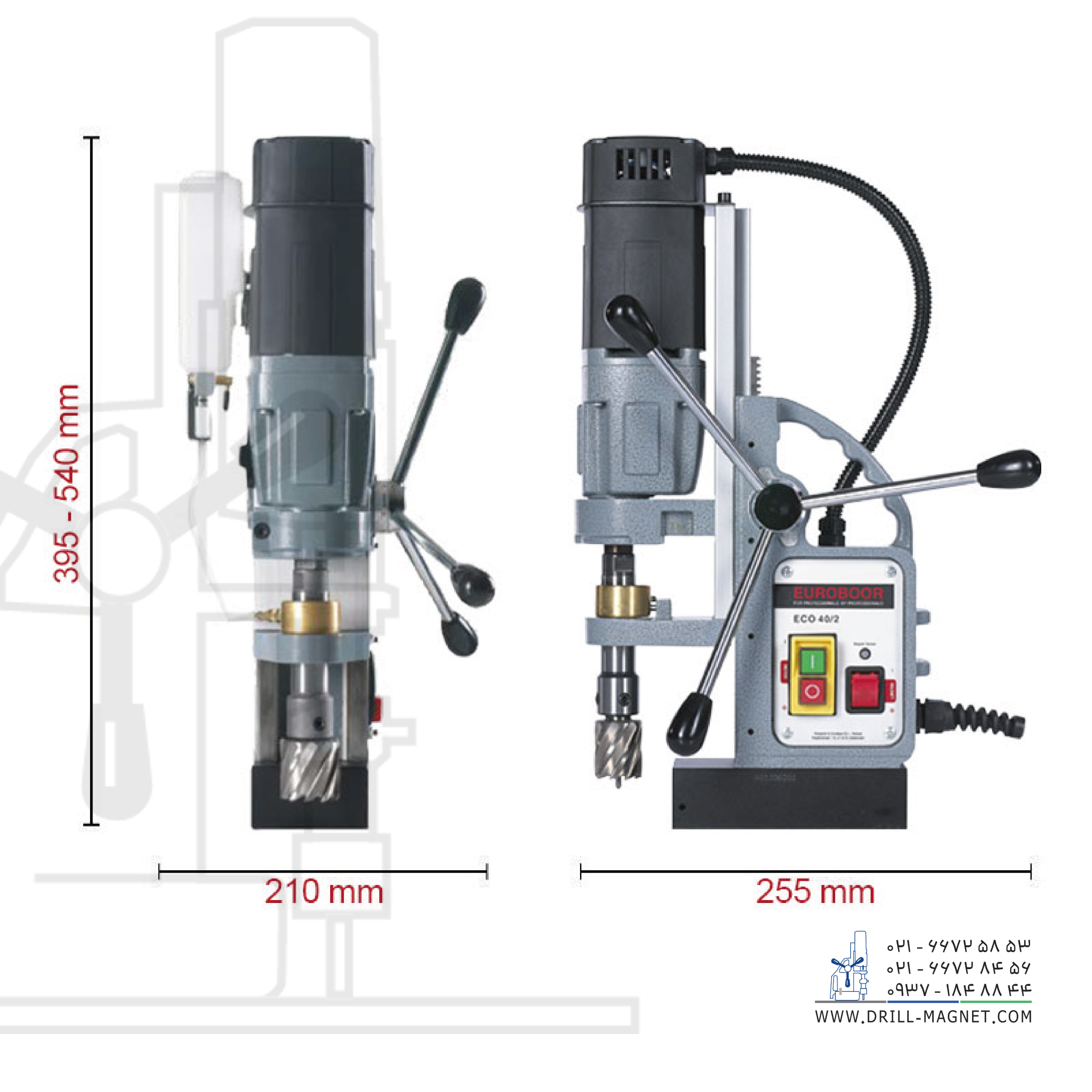 ساخت کشور هلند. دریل مگنت مدل ECO.40/2 محصول شرکت یوروبور هلند با موتور 1100 واتی به دلیل به دلیل وزن سبک 12 کیلوگرمی، حجم کم و قابلیت حمل آسان به کاربر اجازه میدهد تا به راحتی دستگاه را در اماکن مرتفع و یا با دسترسی سخت در انواع حالتهای عمودی و افقی (مانند سازههای فلزی عمودی، تیر ورق و Hهای ساختمانی و …) جابهجا و سوراخکاری کند.