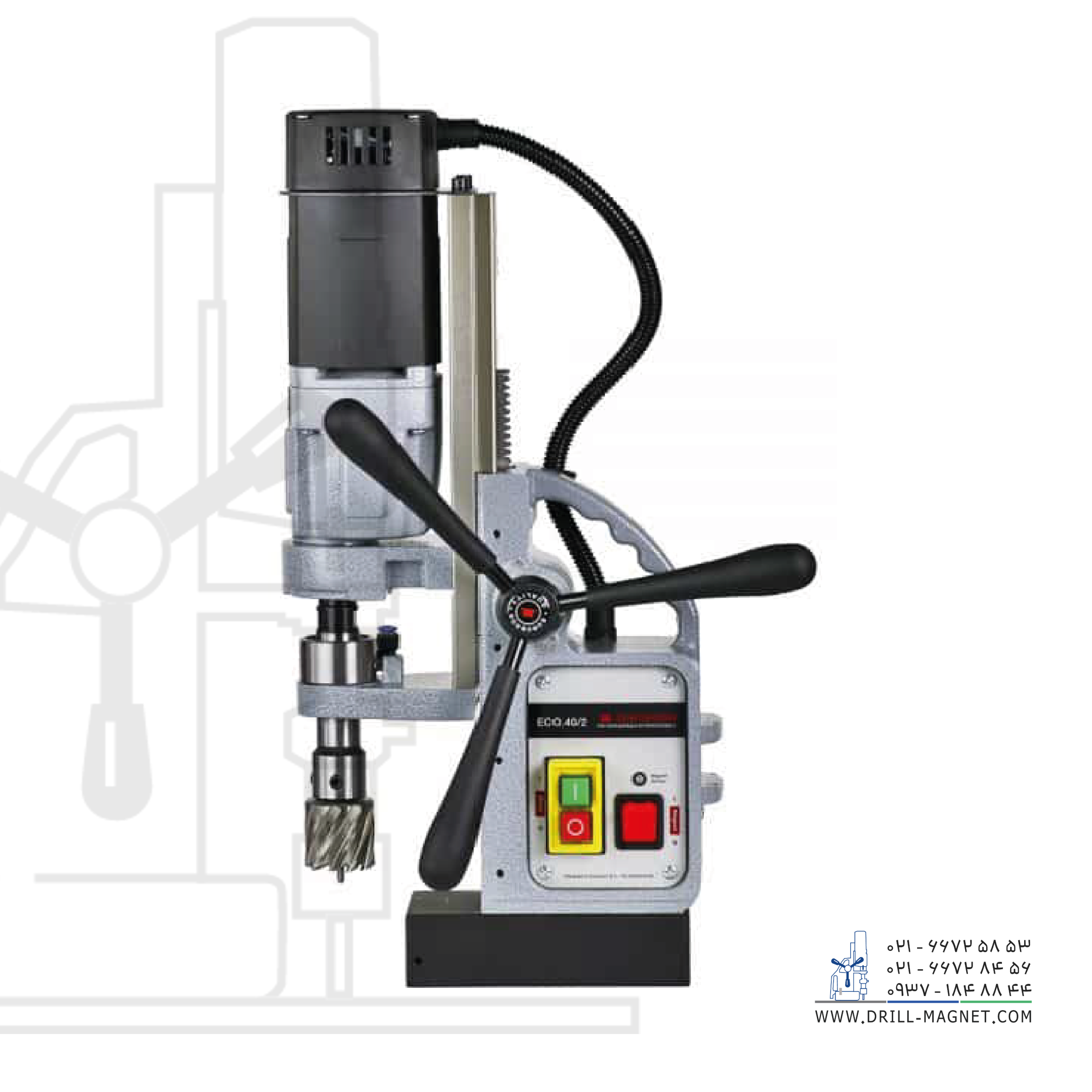 دریل مگنت مدل ECO.40/2 با طراحی موتور پربازده، سرعت 560 دور در دقیقه زیر بار و سرعت 1300 دور در دقیقه بدون بار، تعویض سریع و آسان مته، کورسکاری 150 میلیمتری، دنباله ولدان 19.05 میلیمتری، سوراخکاری با مته گردبر حداکثر قطر 40 میلیمتر و سوراخکاری با مته معمولی حداکثر قطر 13 میلیمتر مناسب سوراخکاری، برش فولاد و مواد مشابه دیگر میباشد.