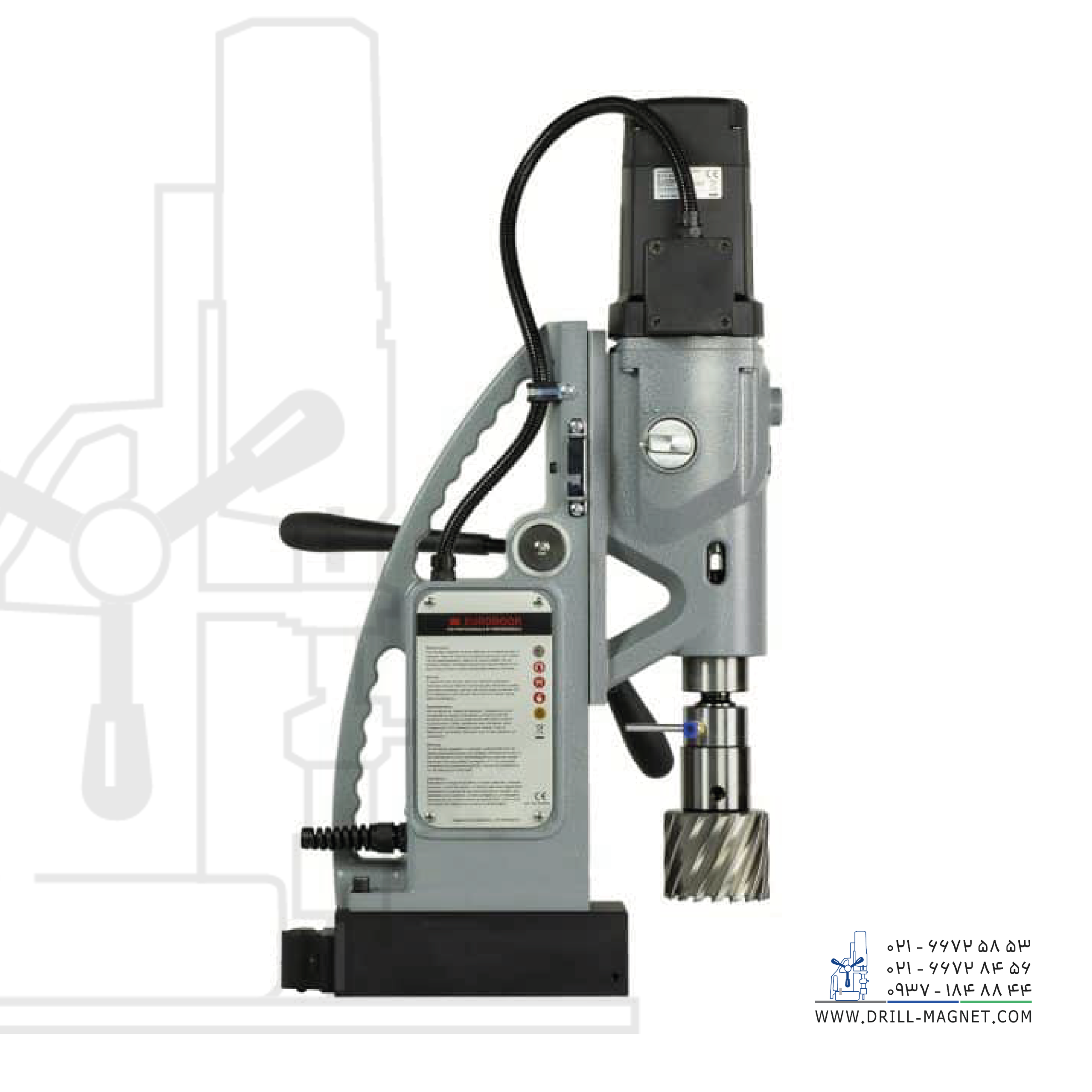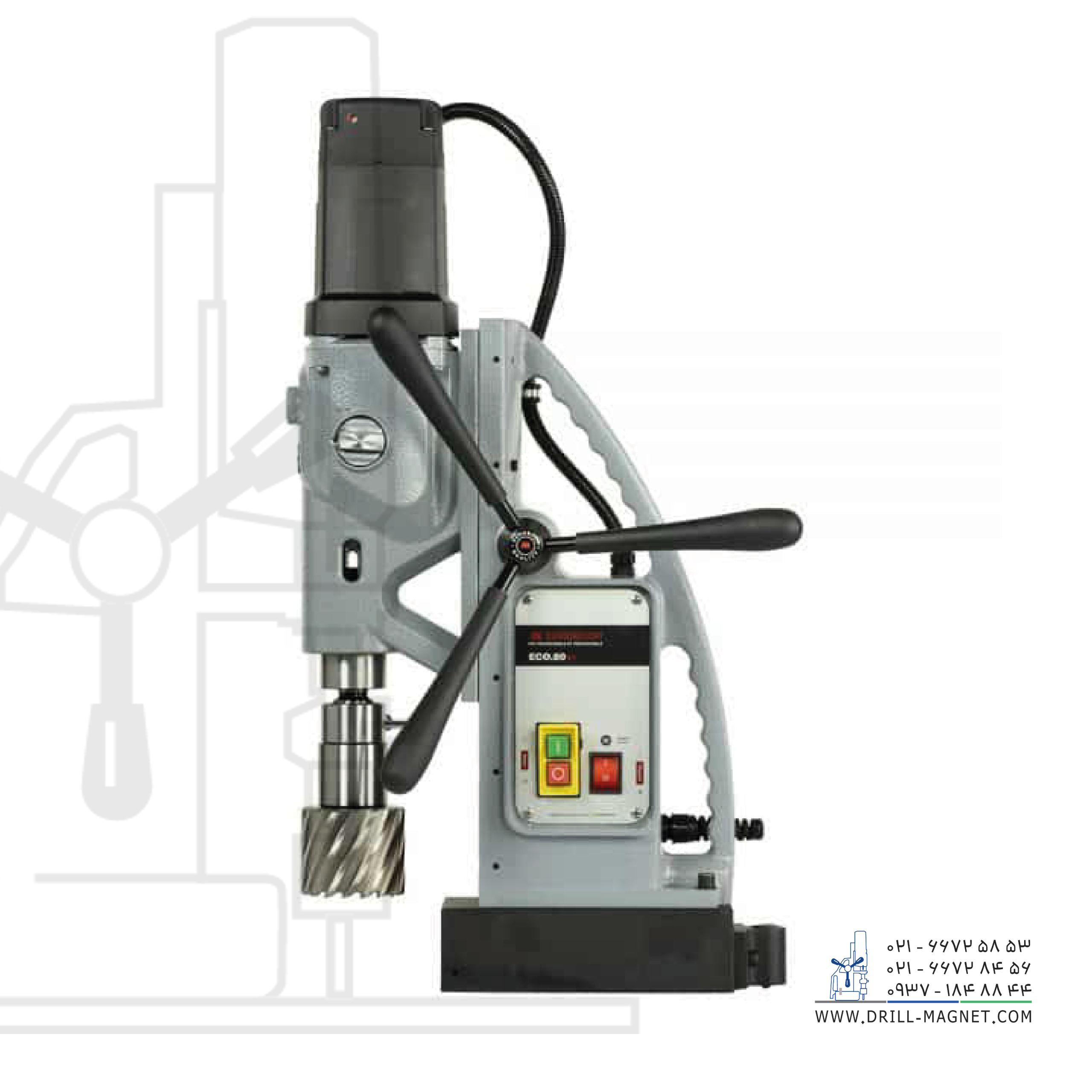 دریل مگنت +ECO.80S یوروبور با طراحی موتور پربازده، سرعتهای 150، 200، 275 و 650 دور در دقیقه زیر بار و سرعتهای ۲۰۰، ۳۰۰، ۴۵۰و ۶۵۰ دور در دقیقه بدون بار، اسپیندل مورس ۳، سوراخکاری با مته گردبر حداکثر قطر 80 میلیمتر، سوراخکاری با مته مارپیچی (ته کولت) حداکثر قطر 32 میلیمتر، ظرفیت خزینهکاری ۸۵ میلیمتر و کورسکاری ۲۶۰ میلیمتر