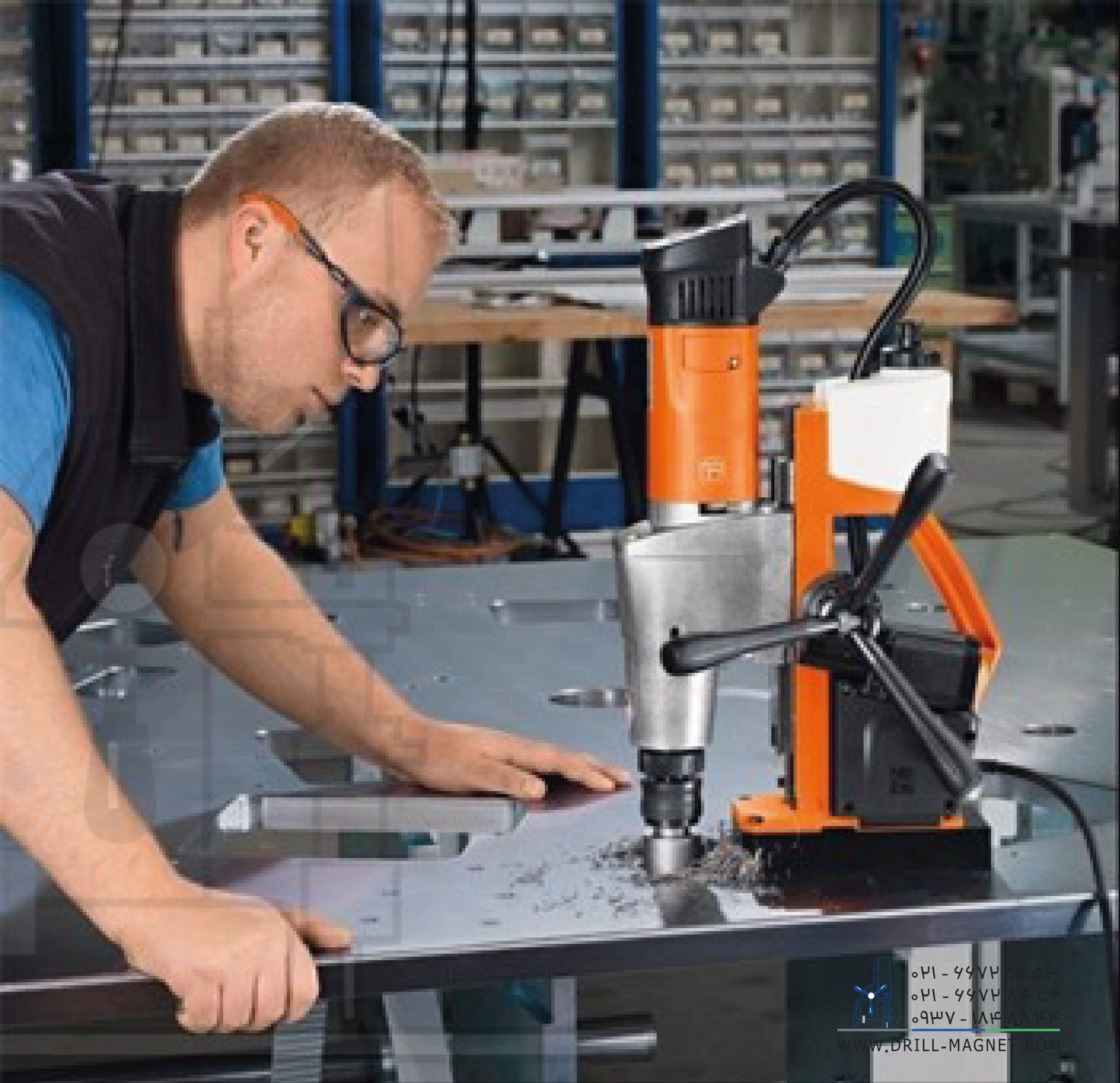 ساخت کشور آلمان. دریل مگنت مدل KBM 50 AUTO محصول شرکت فاین آلمان، با موتور پرقدرت 1200 واتی، قابلیت کار با مته گردبر تا سایز 50، دارای گیربکس دو سرعته و هر دنده گیربکس قابلیت تنظیم دیجیتالی سرعت در 5 مرحله، قابلیت قلاویرکاری، برقوزنی و اتصال مته مرغک، چرخش ساعتگرد و پاد ساعتگرد، روانکار متصل به دستگاه، سیستم جناغی دوبل که امکان استفاده از این دریل را به طور مداوم و با دقت بالا فراهم میسازد و سیستم باردهی اتوماتیک و هوشمند بدون نیاز به اعمال نیرو از جانب اپراتور یک دستگاه دریل حرفه ای با کاربرد صنعتی است.