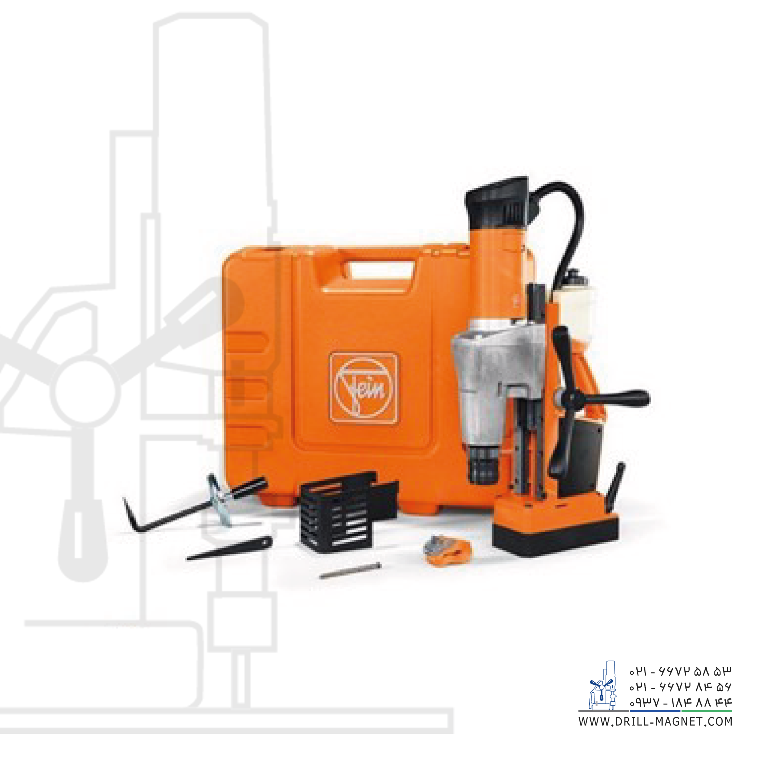ساخت کشور آلمان. دریل مگنت مدل KBM 65 U محصول شرکت فاین آلمان، با موتور پرقدرت 1300 واتی، قابلیت کار با مته گردبر الماسه تا سایز 65 و مته گردبر HSS تا سایز 45، دریل کاری تا قطر 25 میلیمتر، دارای گیربکس مکانیکی دو سرعته و هر دنده گیربکس قابلیت تنظیم دیجیتالی سرعت در 5 مرحله، قابلیت قلاویزکاری، برقوزنی و اتصال مته مرغک، چرخش ساعتگرد و پاد ساعتگرد، نمایشگر میزان چسبندگی مگنت به نحوی که چراغ مگنت در شرایط عدم وجود نیروی کافی جهت نگه داشتن دستگاه به صورت چشمکزن در میآید، روانکار متصل به دستگاه، سیستم جناغی دوبل که امکان استفاده از این دریل را به طور مداوم و با دقت بالا فراهم میسازد و سیستم باردهی اتوماتیک و هوشمند بدون نیاز به اعمال نیرو از جانب اپراتور یک دستگاه دریل حرفه ای برای پروژههای عمرانی (با سازههای فولادی) و پروژههای صنعتی است.
